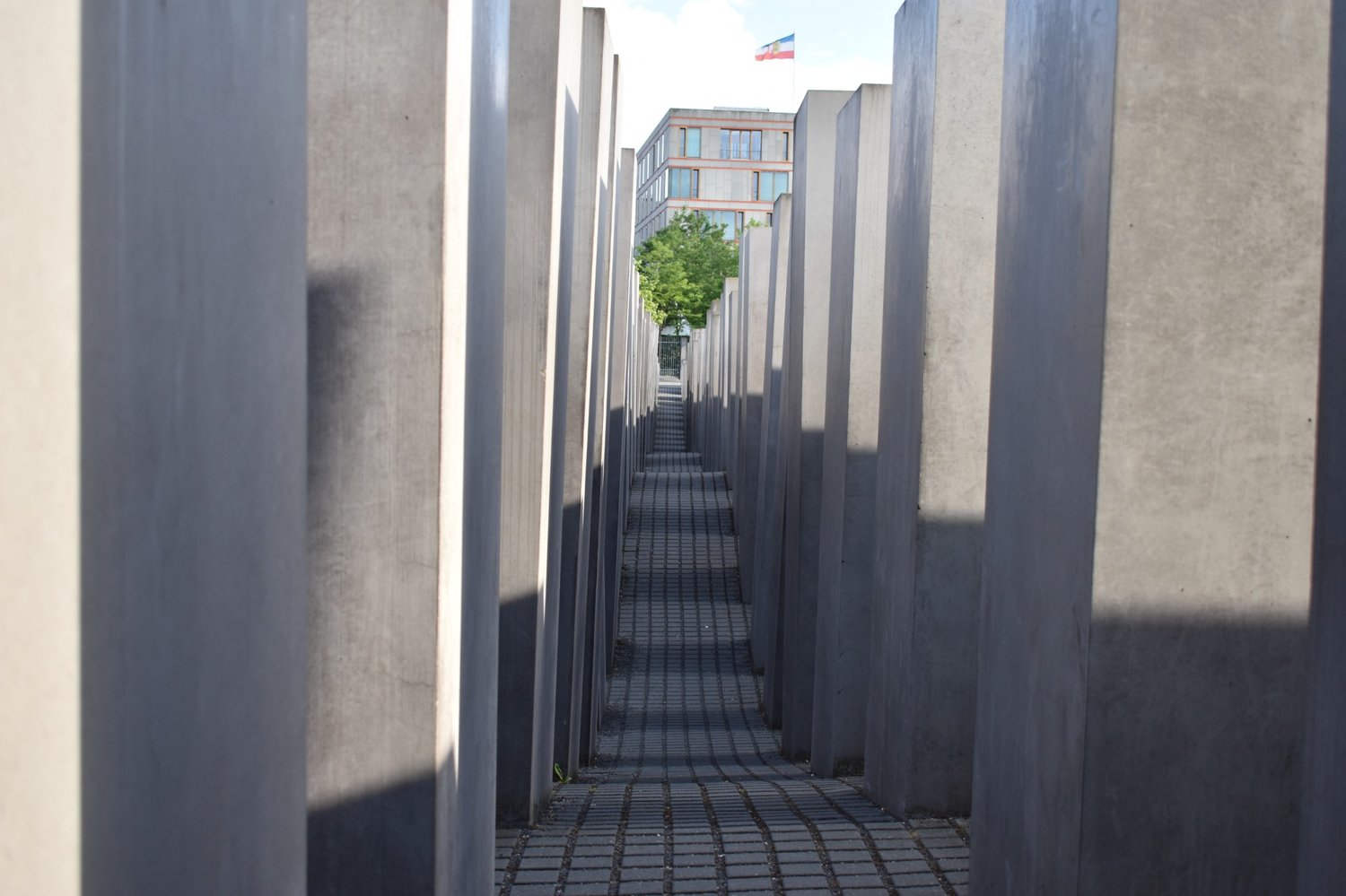 We walk past the Brandenburger Tor after passing on the famous Unter den Linden street, and then turn left to visit the Denkmal für die Ermordeten Juden Europas, the famous square with concrete blocks (called Field of Stelae, designed by Peter Eisenman and Richard Serra) representing the millions of Jewish victims during the Holocaust.