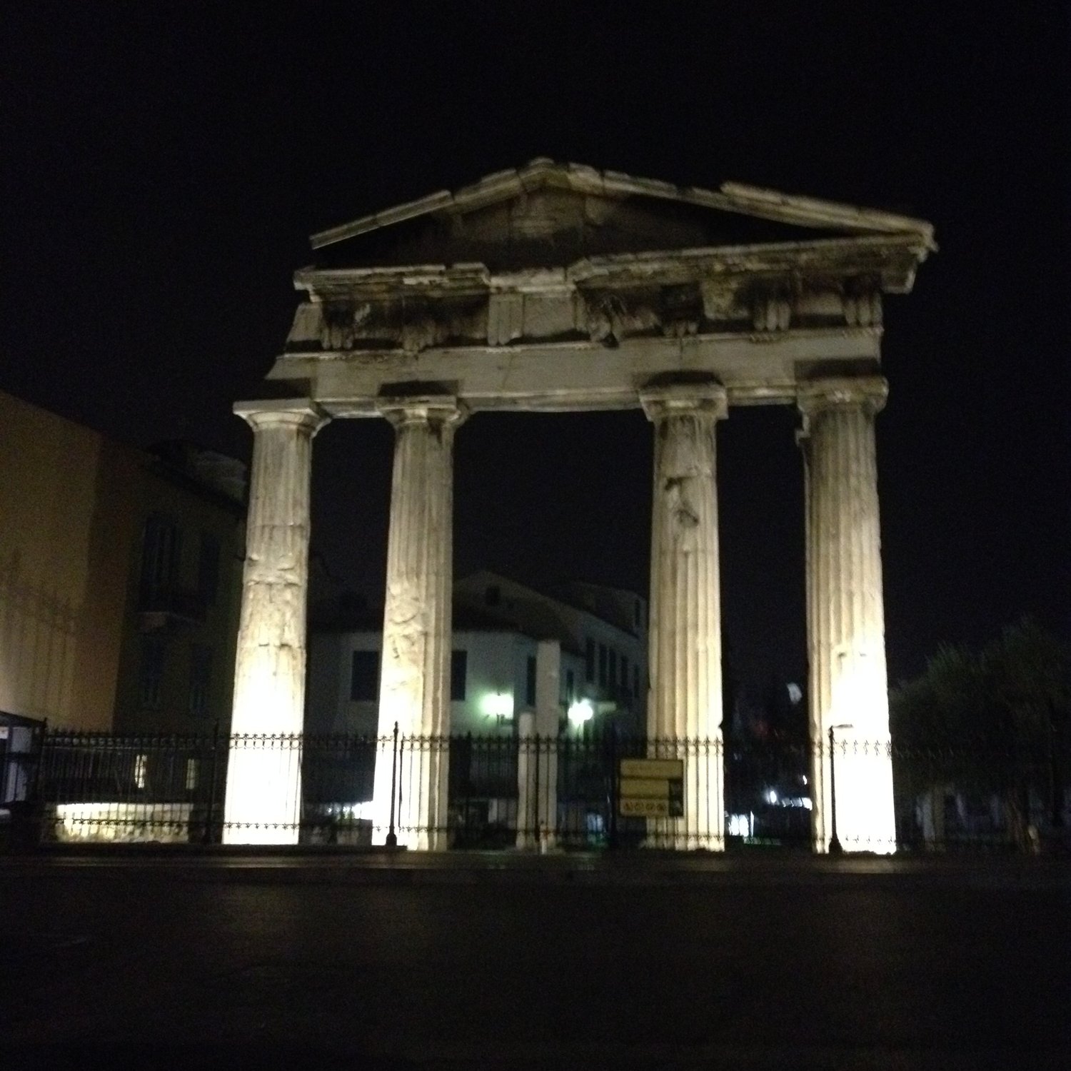 Walking back to the hotel via the Acropolis, we come across several lit-up monuments, orange trees and dozens of street cats.