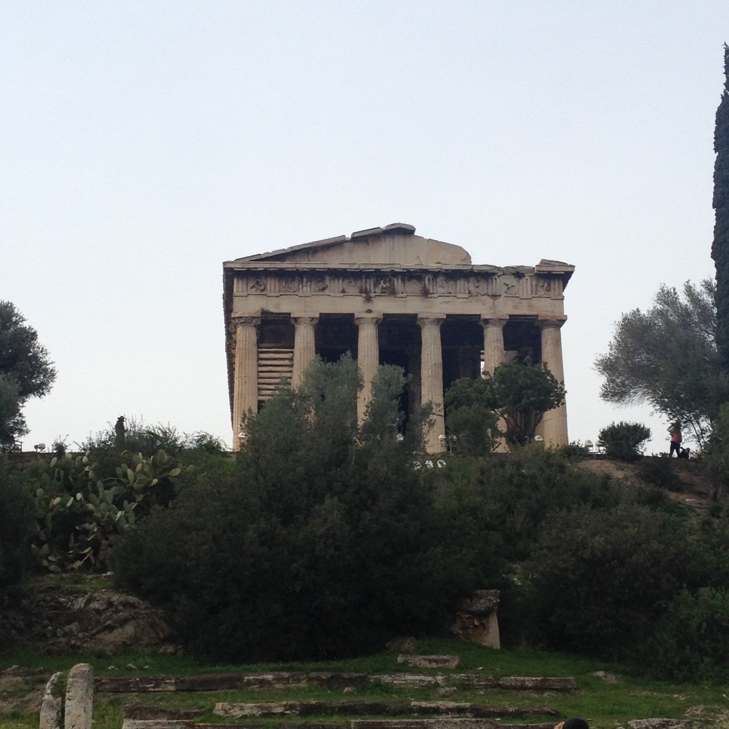At the Agora, we start with the Stoa. It's a marvelous building which houses the museum of the Old Agora. Within the Old Agora you can find the Temple to Hephaestos, one of the best preserved temples in all of Greece, and whoa, what a beauty she is! The temple itself is worth the admission, and then there's a view from the temple site. Some birds had their nests in the temple and sang us their songs.