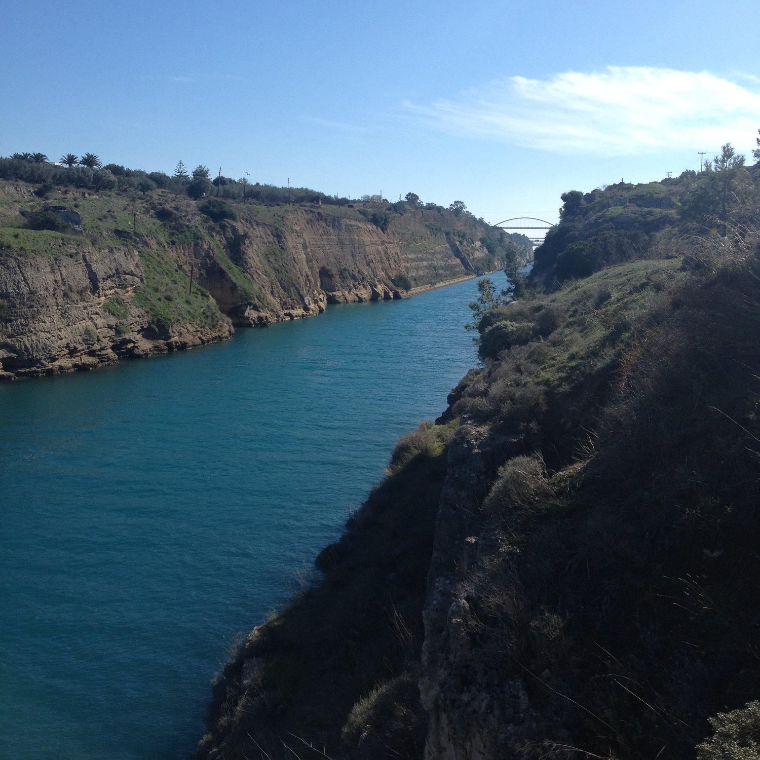 Across from the channel (which was built by slaves by Nero's orders), there's a pedestrian bridge that's supposed to be worth it. After walking in the sand and sun for about half an hour, we realize that the bridge is nothing more than a concrete construction for sewage pipes, which is noticeable by the smell. We turn around and head for Ancient Corinth.