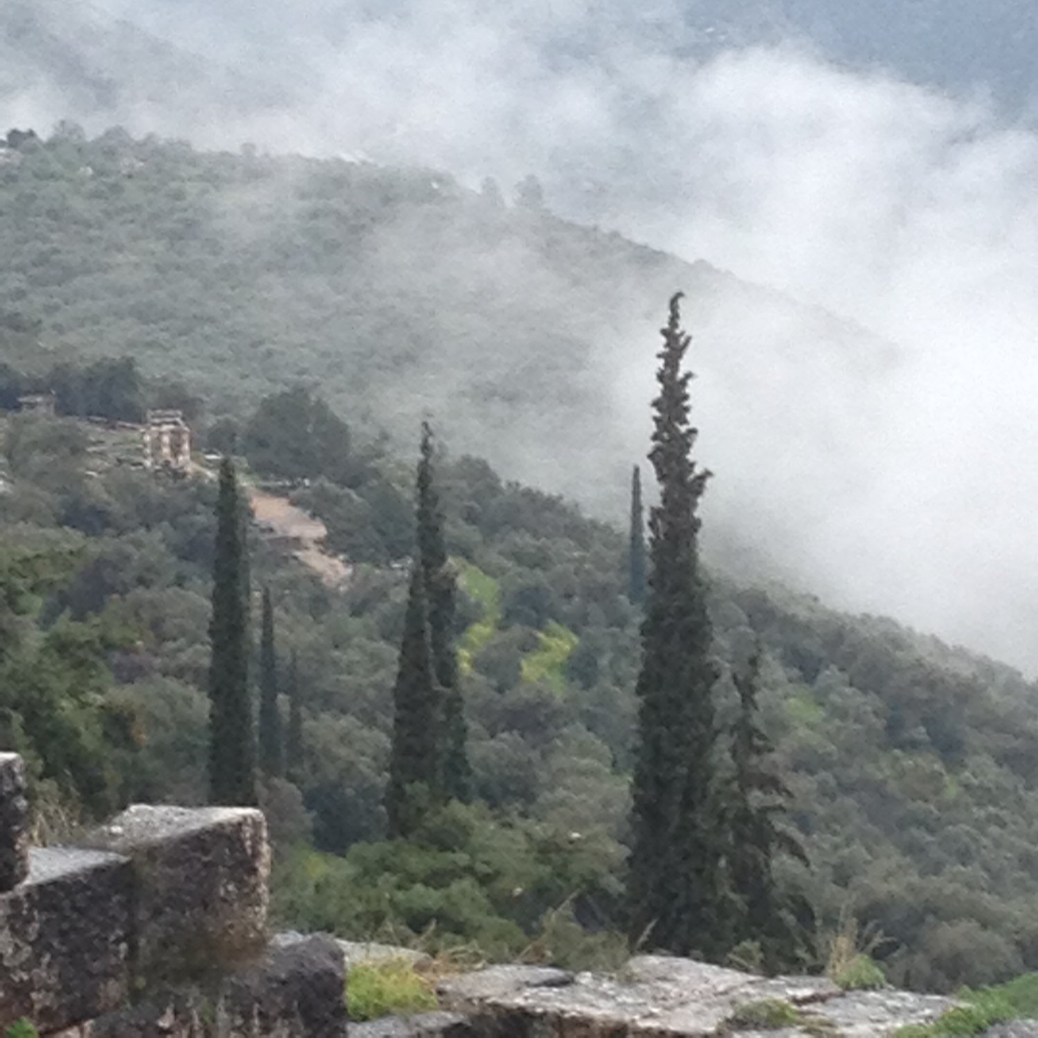 It's cloudy and raining, so there's not a whole lot we can see from the top of the mountain. The whole journey in Greece will end in Athens (because our flight leaves from the Athens airport), so if we have the time and the weather is better, we might come back for this.